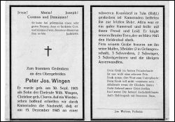 Opfer 2. Weltkrieg; Eltern: Wilhelm Wingen u. Christine geb. Claren; Bruder Theo im März 1945 gefallen (2. Weltkrieg); 2 Brüder in Kriegsgefangenschaft |