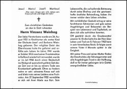Eltern: Josef und Barbara Weinhag; 1941 Soldat, durch Steckschuß in Rußland im Juli 1944 querschnittsgelähmt (Opfer 2. Weltkrieg); ∞ 27.9.1952 Anni Abels aus Buir; starke Schmerzen; Vater vor 4 Mon. † |