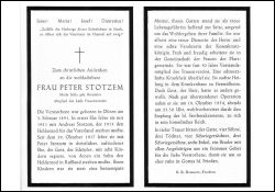 ∞ 1911 Andreas Stotzem, gefallen 1915 im 1. Weltkrieg; ∞ 19.10.1917 Peter Stotzem; 8 K., davon 1 Sohn in Rußland im 2. Weltkrieg gefallen; Vorstandsmitgl. d. Frauenvereins (Druck in Frechen) |