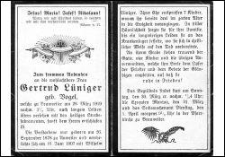 ∞ 16.6.1907 Wilhelm Lüniger; 7 K., davon 3 früh †; langwieriges Leiden |