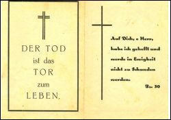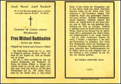 ∞ 29.9.1926 Michael Bachhausen aus Blatzheim; erlebte das "Elend…, als der Feind unser Dorf erstürmte u. alle Einwohner längere Zeit einsperrte"; ihre geschwächte Gesundheit dabei ganz zerrüttet |