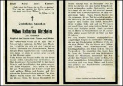 ∞ mit 34 J. Landwirt Arnold Blatzheim aus Niederbolheim, † 1.11.1927; 6 K., davon 1 früh †; ältester Sohn im Dez. 1943 einberufen, später im Lazarett in Soest schwere Operation |