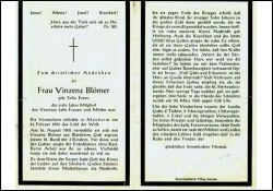 ∞ 16.8.1908 Vinzenz Blömer aus Blatzheim; 3 K.; Sohn Johann im 2. Weltkrieg vermißt; zuletzt Krankheit und Unfall ihres Gatten |