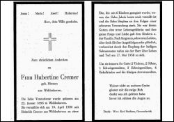 ∞ 10.4.1920 Heinrich Cremer aus Widdeshoven; 6 K.; Sohn Jakob vermißt, Sohn Stephan an schwerer Verwundung † (2. Weltkrieg) |