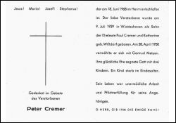 Eltern: Paul Cremer u. Katharina geb. Wißdorf; ∞ 28.4.1950 Gertrud Metzen; 3 K., davon 1 früh † |