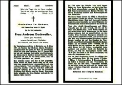 Eltern: Johann Mausbach u. Agnes geb. Buff; ∞ 17.1.1896 Andreas Dackweiler aus Blatzheim; 10 K., davon 1 nach Geburt †; heranwachsender Sohn Theodor †; 1946 Goldhochzeit |