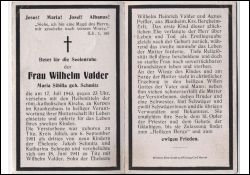 Tod im Kindsbett; Eltern: Jakob Schmitz u. Katharina geb. Schnepp; ∞ 18.6.1941 in Titz Wilhelm Valder, Sohn von Wilhelm Heinrich Valder u. Agnes geb. Peiffer aus Manheim; 1. K. starb unmittelbar nach der Geburt; bei Geburt des 2. K. starb die Mutter |