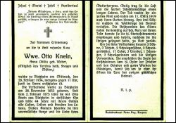 ∞ 2.2.1875 Otto Knein aus Blatzheim, † 11.3.1919; 7 K., davon 1 früh †; Beschwerden des Alters |