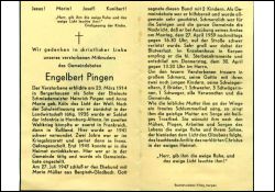 Eltern; Schmiedemeister Heinrich Pingen u. Anna Maria geb. Köln; 1941 im 2. Weltkrieg verwundet; nach 1945 Gemeindebote; ∞ 27.7.1947 Maria Müller aus Bergisch Gladbach; 2 K.; am 27.4.1959 auf der Straße schwer verletzt |