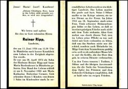 Landwirt; Eltern: Reiner Ripp u. Anna Maria geb. Bardenheuer, † 18.9.1943; ∞ 8.11.1908 Maria Katharina Hubertine Cremer; 5 K., davon 1 früh †; 3 Söhne Soldat im 2. Weltkrieg |