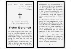 Eltern: Adam Berghoff u. Gertrud geb. Kamphausen, † 19.6.1956; ∞ 19.10.1912 Maria Zündorf; 5 K., davon 2 † u. Sohn Josef im 2. Weltkrieg gefallen; Mitgl. d. Kirchenchores |