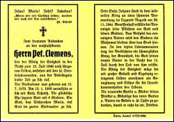 ∞ 13.1.1906 Katharina Schmitz; 6 K.; Tochter Maria im Kindesalter †; Sohn Johann 28.11.1944 im 2. Weltkrieg gefallen; schmerzliche Krankheit |
