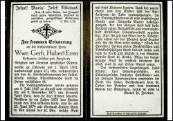 ∞ 9.11.1871 Heinrich Josef Even, † 1876; 3 K.; ∞ 25.6.1879 Gerhard Hubert Even; 6 K.; Gatte u. 3 K. †; |