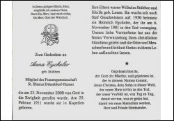 Mitgl. Frauengemeinschaft Düsseldorf-Hamm; Eltern: Wilhelm Stübben u. Sibille geb. Losen; ∞ 1950 Heinrich Eyckeler, † 6.11.1981 |