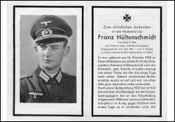 Gefallener 2. Weltkrieg; Eltern: Holzmeister Klemens Hültenschmidt u. Elisabeth geb. Schulte; Mutter n. Geburt †, umsorgt von Tante; 1937 Abitur; 1940 Leutnant; Heldenfriedhof in Tour a.d. Mündung der Tigora i.d. Wolchow |