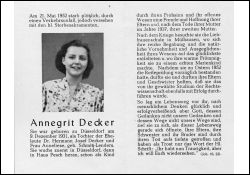 Verkehrsunfall; Eltern: Dr. Hermann Josef Decker u. Anneliese geb. Schmitz-Lenders, † 1937; wuchs zuerst in Düsseldorf, dann in Haus Pesch heran; Liebfrauenschule in Mülhausen; 1952 Abitur |