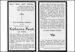 ∞ 22.10.1898 Jakob Pesch aus Stommeln; 10 K., davon 3 † , darunter 1 verh. Tochter mit 2 Kindern, denen sie 4 J. die Mutter ersetzte |