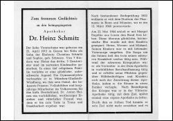 Apotheker; Eltern: Christian Schmitz u. Sophie geb. Schwarz; sein Onkel: Priester u. Volksbildner (Volksverein für das kath. Deutschland) Dr. Anton Heinen; ∞ 22.5.1944 Margot Engelke aus Lünen; 3 K.: Heinz, Werner, Michael; Dom-Apotheke, Viktorian-Apotheke (Köln?); gerade fertiggestelltes Heim in Geyen; Friedhof Geyen |