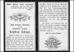 Jungfrau; ihr Dienstherr † 25.11.1919; kurzes Glück sorgloser alter Tage; in der Nacht vom 3. zum 4.7.1922 Opfer eines verabscheuungswürdigen Verbrechens |