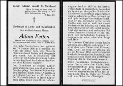 Eltern: Hermann-Josef Fetten u. Margarete geb. Kirsch; ∞ 30.11.1916 Sophia Peters aus Aldenhoven; 3 K.; 3 Brüder Priester; 27 J. Lehrer in Essen-Kupferdreh; seit 1937 Lehrer in Euskirchen, Rektor der Nordschule; Mitgl. Kirchenvorstand Herz Jesu in Euskirchen; schwere Krankheit in den letzten Monaten |