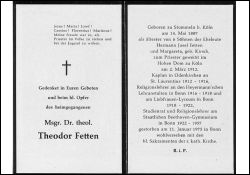Eltern: Hermann Josef Fetten u. Margareta geb. Kirsch; 2.3.1912 Köln Priesterweihe; Kaplan in Odenkirchen 1912-16; Religionslehrer in Bonn:Hermann'sche Lehranstalten, Liebfrauen-Lyceum, Beethoven-Gymnasium (Studienrat) |