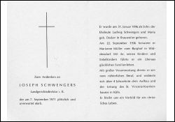Landgerichtsdirektor i.R.; Eltern: Ludwig Schwengers u. Maria geb. Decker; ∞ 22.9.1936 Marianne Müller vom Burghof in Widdersdorf; Kinder; 4 Jahrzehnte Leitung des. St. Vincenz-Krankenhauses in Köln |