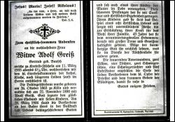 ∞ 22.11.1890 Adolf Greiß, † 28.3.1906; 7 K.; 43 J. als Hebamme tätig |