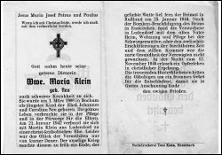 Eltern: Johannes u. Carolina Neu; sorgte ihr ganzes Leben lang für die Eltern; ∞ 21.1.1942 Martin Klein aus Ludendorf, im 2. Weltkrieg bald darauf gefallen in Rußland 25.1.1944; nach Ausbombung in Euskirchen wohnte sie b.d. Schwiegereltern in Ludendorf |