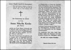 ∞ 18.7.1913 Josef Krebs; schmerzhafte, schleichende Krankheit; 1 überlebende Tochter; Druck in Köln-Sülz |