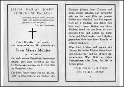 Eltern: Johann Peter Zimmer u. Anna geb. Melder; ∞ 24.9.1926 Johann Melder aus Odendorf; 3 K., davon 1 früh †; |