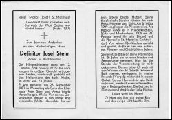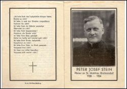 Langes Leiden; Eltern: Peter Stein u. Anna Maria Veronika geb. Weiss; Priesterweihe 6.3.1909; Kaplan in Niederkrüchten, Sürth u. Meckenheim; 28.2.1928 Pfarrer an St. Matthias in Kirchtroisdorf |