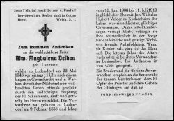 ∞ 15.6.1906 Johann Wilhelm Hubert Velden zu Kuchenheim, † 11.7.1919; kinderlos; letzte Lebensjahre b. Verwandten in Ludendorf |