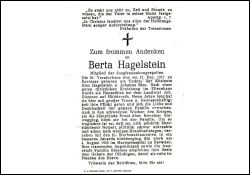 Eltern: Alex Hagelstein u. Johanna Bies; 9 J. lang Hausstütze beim Landwirt Johann Gleumes auf Hüdderath; Mitgl. Jungfrauenkongregation |