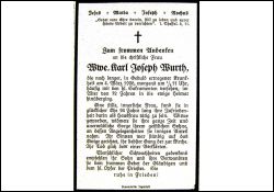 72 J.; ∞ Karl Joseph Wurth, nach 24 J. Ehe †; als widmete sie ihre ganze Sorge ihrem geistlichen Sohn Dr. Karl Joseph Wurth, *4.2.1869 in Cobeshofen, Pf. Hückeswagen, seit 1925 StR/StDir in Düsseldorf |
