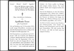 Eltern: Johann Angermund u. Anna geb. Kollenbroich; ∞ 16.9.1911 August Esser, † ca. 1909; 3 K., davon 1 nach Geburt †, 1 Sohn im 2. Weltkrieg gefallen; Druck in Dormagen |