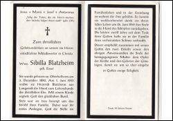 ∞ 1.6.1923 Heinrich Blatzheim aus Langenich; 1 K.; nach dem Tod ihres Gatten vor 12 J. lebte sie in der Familie ihres verheirateten Sohnes; Druck in Kerpen |