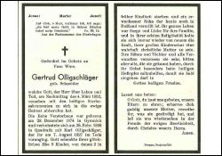 ∞ 28.2.1898 in Quadrath Karl Olligschläger, † 7.8.1927; 9 K., davon 2 früh †, 1 Sohn im 2. Weltkrieg in Russland vermisst; Druck in Bergheim/Erft |
