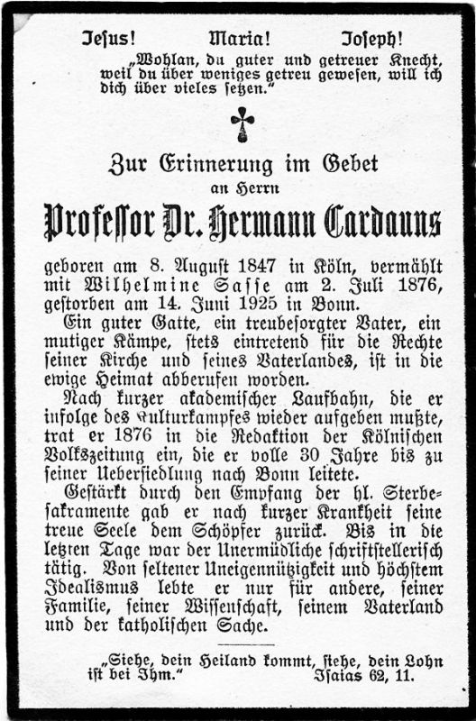 | Prof. Dr.; ∞ 2.7.1876 Wilhelmine Sasse; infolge Kulturkampf Aufgabe seiner akademischen Laufbahn; seit 1876 in der Redaktion der Kölnischen Volkszeitung, 30 J. deren Leiter |