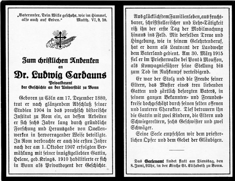 | Gefallener 1. Weltkrieg; Dr.; 1904 im preuß. histor. Institut in Rom; ∞ 1.10.1907 Helene Krings; 1910 Privatdozent der Geschichte in Bonn; seit 1914 Leutnant der Landwehr im 1. Weltkrieg |