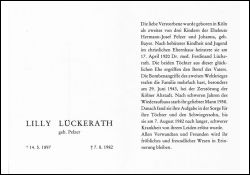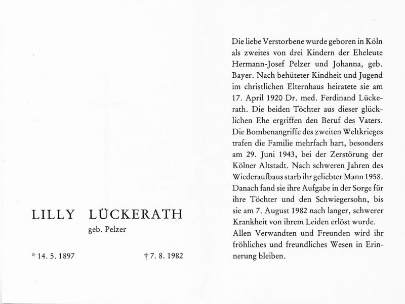 | Eltern: Herm.-Jos.Pelzer u.Johanna geb. Bayer; ∞ 17.4.1920 Dr. med. Ferdinand Lückerath, † 1958; 2 Töchter (Ärztinnen); 29.6.1943 Haus in Köln-Altstadt durch Bomben zerstört |