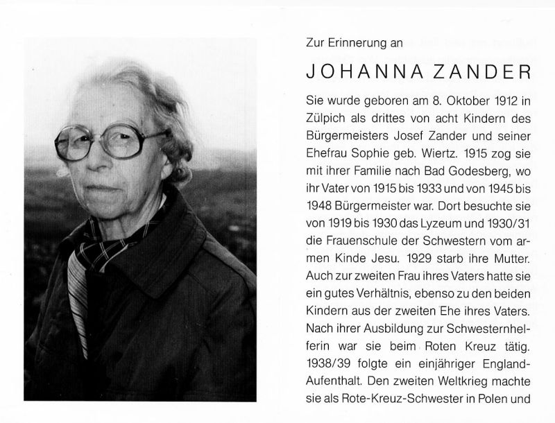 | Eltern: Josef Zander (1915-33 u.1945-48 Bürgermeister in Bad-Godesberg) u.Sophie geb.Wiertz,†1929; im 2. Weltkrieg Rote-Kreuz-Schwester in Polen u.Rußland; 1945-77 Uniklinik Bonn |