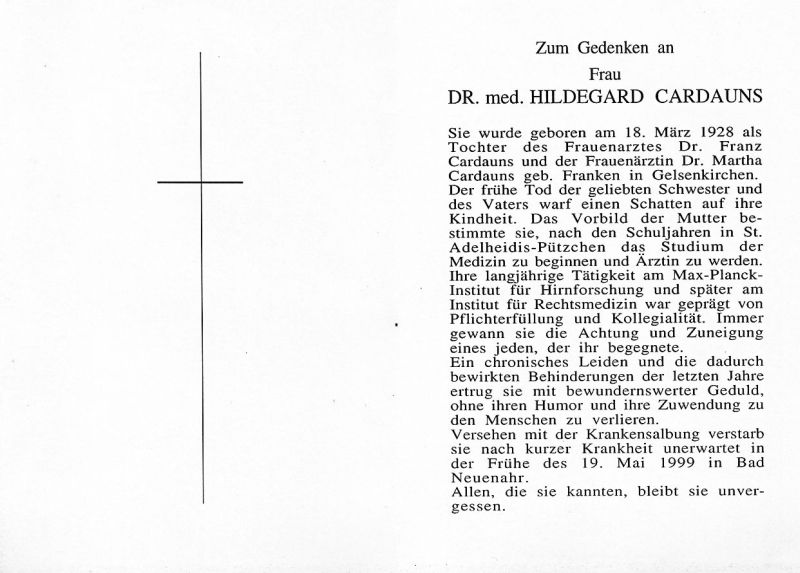 | Eltern: Dr. Franz Cardauns u. Dr. Martha geb. Franken (Frauenärzte); Schule: St. Adelheidis-Pützchen; Tätigkeit Max-Planck-Inst. für Hirnforschung; später Inst. Für Rechtsmedizin |