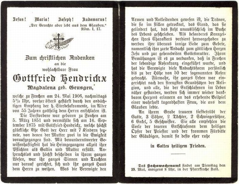 | ∞ 16.09.1875 mit Gottfried Hendrickx; 7 Kinder, davon 2 †; |