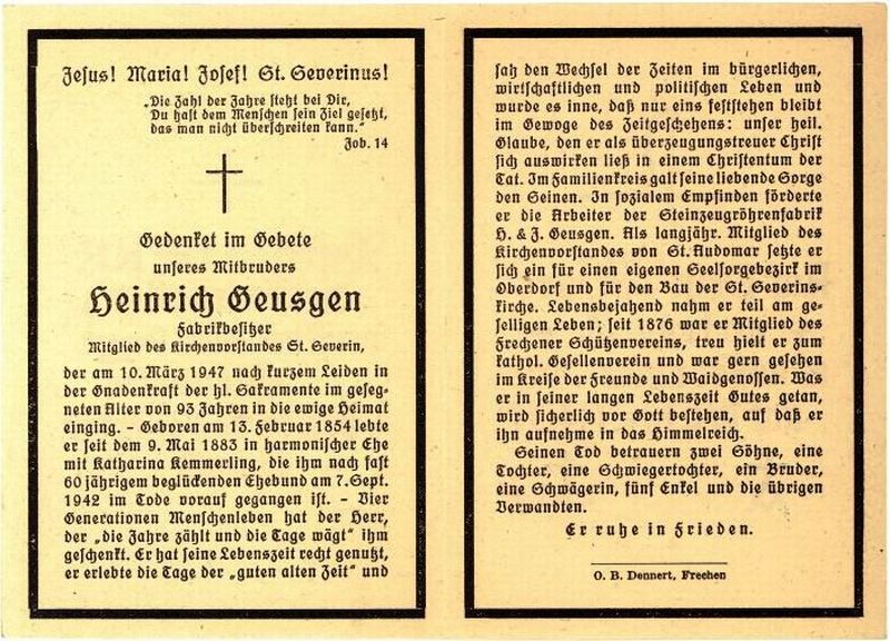 | Fabrikbesitzer; ∞ 09.05.1883 mit Katharina Kemmerling, 2 Söhne, 1 Tochter; 07.09.1942 †; Mitglied des Kirchenvorstandes; seit 1876 Mitglied des Frechener Schützenvereins; |