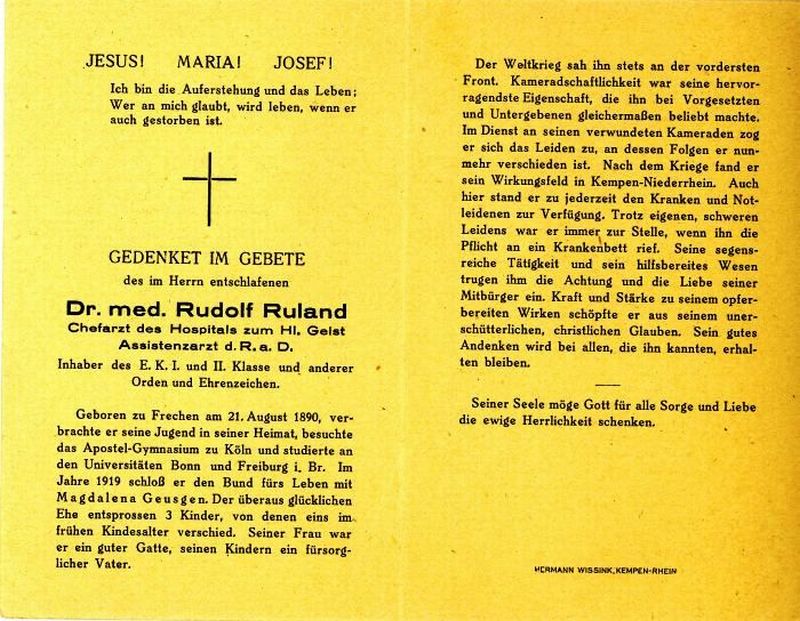 | ∞ 1919 mit Magdalena Geusgen; 3 Kinder, davon 1 im frühen Kindesalter †; Chefarzt des Hospitals zum Hl. Geist, Assistenzarzt d.R. a.D.; Wirkungskreis in Kempen-Niederrhein; |