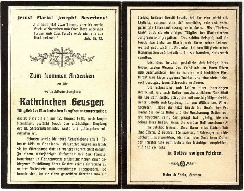 | wohlachtbare Jungfrau; 2 Brüder, 1 Schwester; Mitglied der Marianischen Jungfrauenkongregation; |