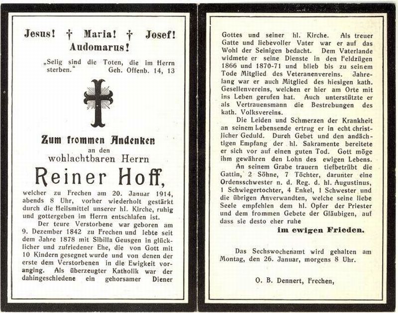 | ∞ 1878 mit Sibilla Geusgen; 10 Kinder; Mitglied des Gesellenvereins; Teilnehmer der Feldzüge 1866 und 1870-71; |