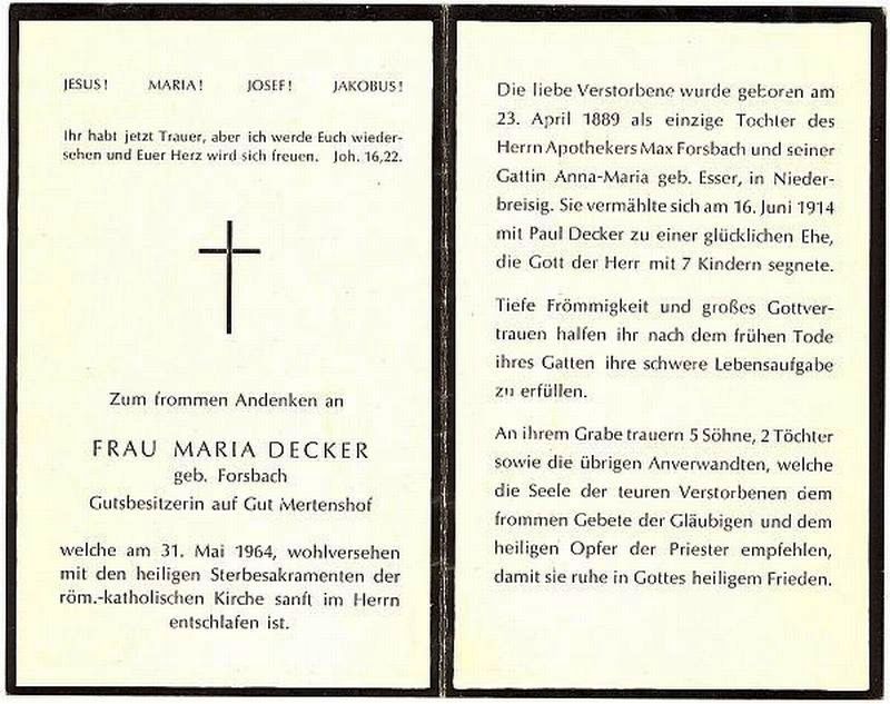 Eltern Apotheker Max Forsbach und Anna-Maria geb. Esser; ∞ am 16.06.1914; 7 Kinder; Gutsbesitzerin auf Gut Mertenshof; |