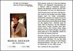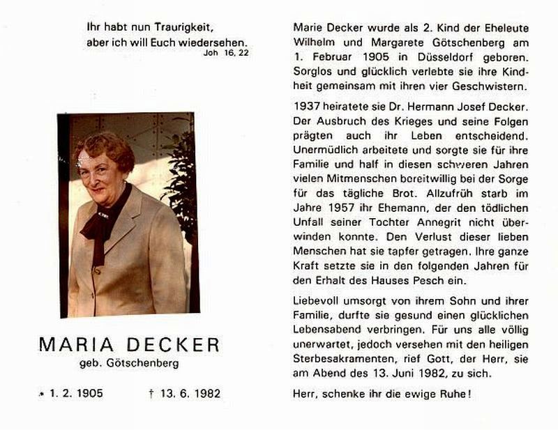 Eltern Wilhelm und Margarete Götschenberg; 4 Geschwister; ∞ 1937 mit Dr. Hermann Josef Decker, 1957 †; |