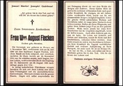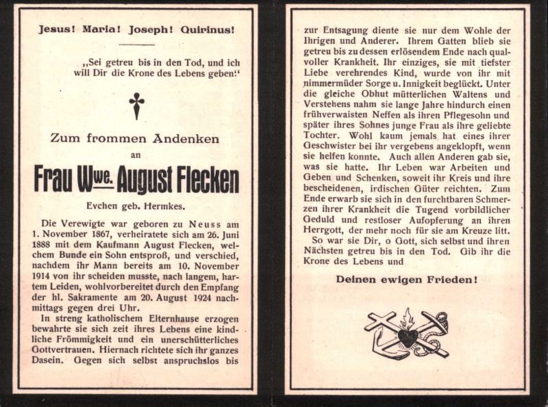 | ∞ 26.6.1888 Kaufmann August Flecken, † 10.11.1914; 1 Sohn; langes, hartes Leiden; nahm frühverwaisten Neffen als ihren Pflegesohn auf |